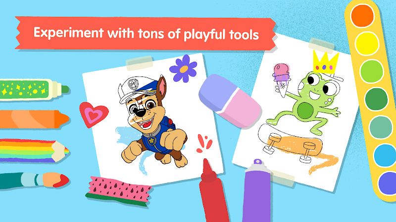 The game's cleverest trick is the way it manages to reward completion without making art into a competition. As a child fills 75 % of a page, a soft chime sounds and the outline stiffens into a paper cut-out that can be pulled around the screen. Drop Chase onto an empty background and you'll enable a tiny sticker mode in which previously colored pages transform into movable characters who kids can use to stage their own rescue missions. These custom scenes can be exported to the device camera roll, printed as postcards using AirPrint, or shared directly and securely to a parent-approved contact list using the Piknik Parent App.